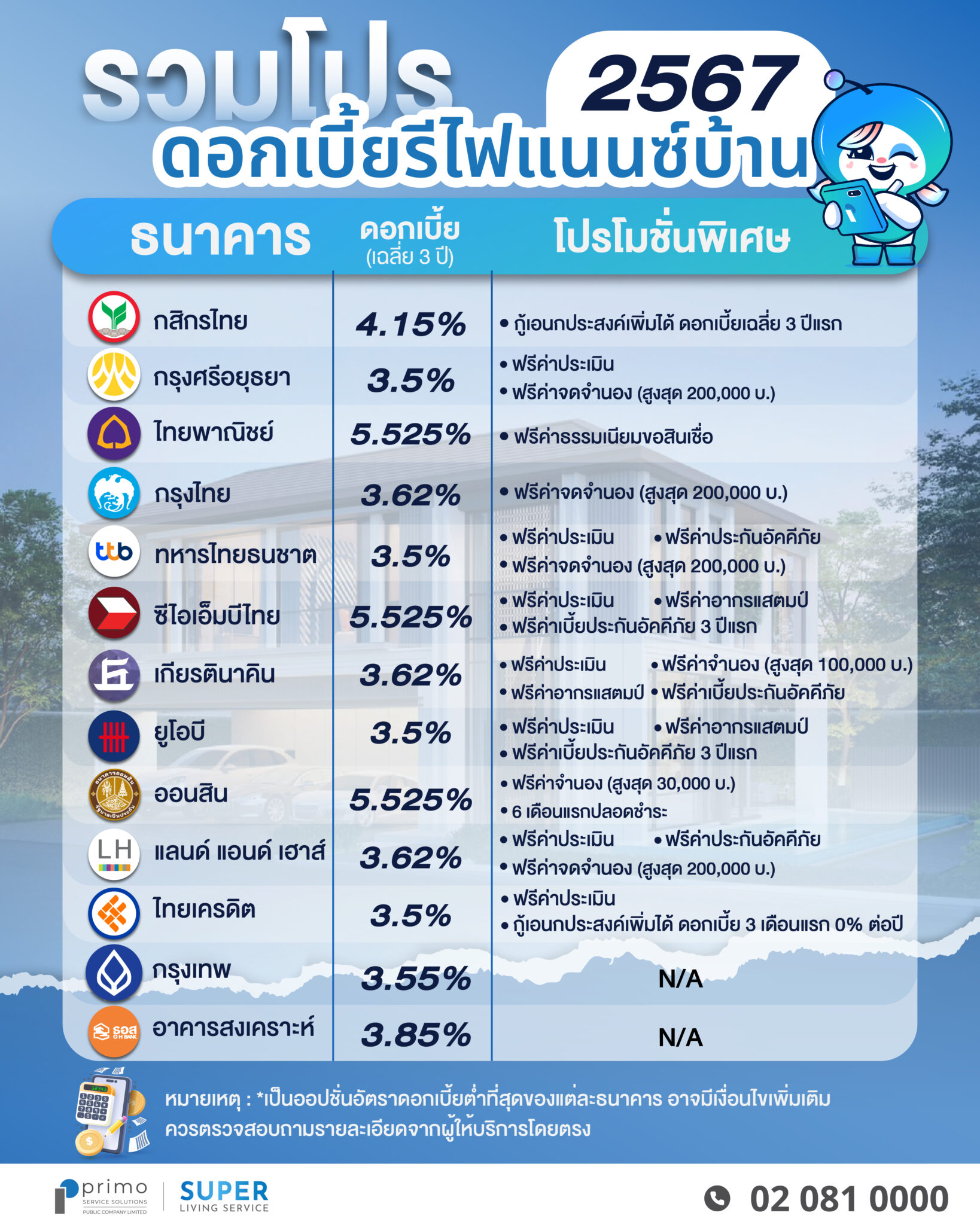 ให้อัตราดอกเบี้ยสินเชื่อรีไฟแนนซ์บ้าน MRR = 3.15% ตลอด 3 ปีแรก โดยมีอัตราดอกเบี้ยเฉลี่ย 3 ปีเท่ากับ 4.15% และให้วงเงินกู้ไม่เกิน 100% ของราคาประเมินหลักประกัน